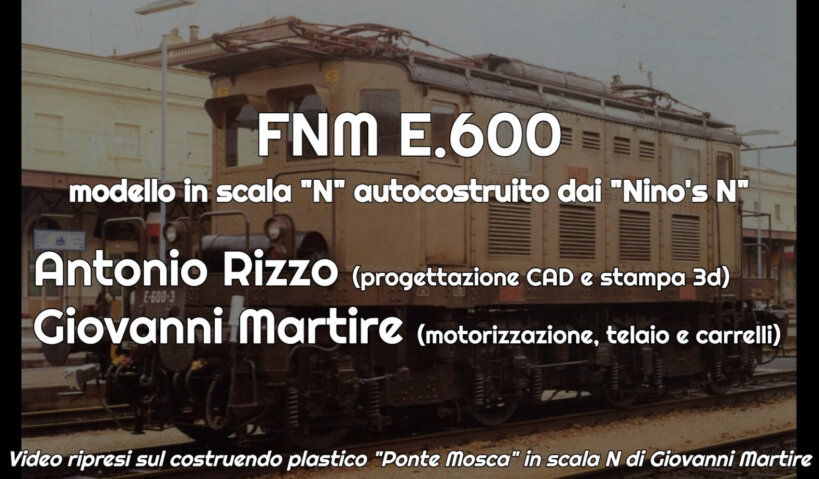 Locomotiva ellettrica FNM E.600 in scala "N" delle Ferrovie Nord Milano (FNM). Il modello si avvale del disegno e della stampa in 3d per la carrozzeria, il telaio e i carrelli. Motorizzazione su 2 carrelli, motore bialbero comprato su Ali, corpo carrelli recuperati da loco Minitrix e adattati con supporto disegnato e stampato. Realizzazione in collaborazione con Giovanni Martire.